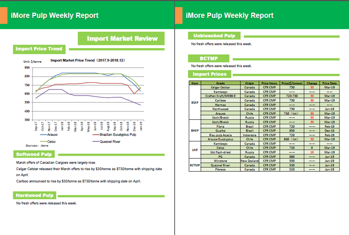 Imore Paper supplies reliable price reference through deeply Chinese market understanding from our professional and precise methodology. Currently, for international market, we supplied Chinese Pulp & Downstream Market Weekly Report, Chinese Recovered Paper & Packing Paper Markets Weekly Report, and Chinese Paper Market Annual Reports for English edition, and customized consulting service as well.